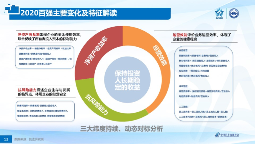 為協助更多企業完成由強向優的轉型升級,2020中國汽車經銷商大會在發布百強經銷商集團營收榜單的基礎上,突破性地為所有經銷商集團、經銷商單店提供三大對標服務:凈資產收益率對標、抗風險能力對標、運營效能對標。通過建立完善的對標體系,促進廠商關系平衡,助力經銷商集團提升服務運營能力,進而提升整體發展水平。