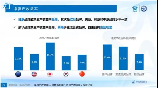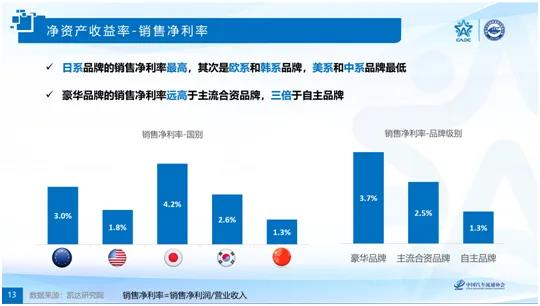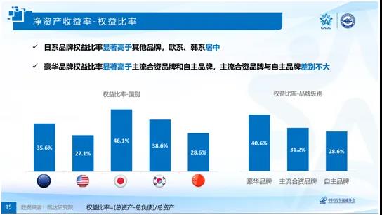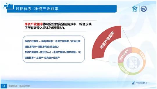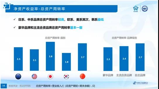 該對標體系體現企業的資金使用效率,綜合反映了所有者投入資本的獲利能力。研究結果表明:日系品牌經銷店的凈資產收益率最高,其次是歐系品牌,美系、韓系和中系品牌的凈資產收益率偏低且水平基本一致。豪華品牌的凈資產收益稍高于主流合資品牌,自主品牌在該指標上的表現明顯落后。報告對經銷商的銷售凈利率、總資產周轉率和權益比率三個指標進行了詳細解讀。