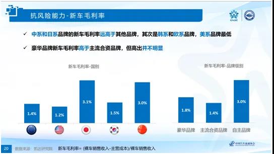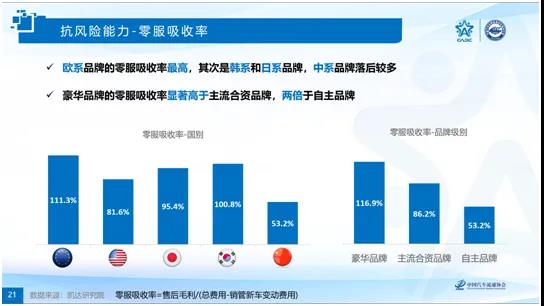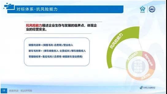 該對標體系描述企業生存與發展的臨界點,體現了企業的經營安全。研究結果表明:日系品牌經銷店的抗風險能力最高,表現在新車毛利率和銷售利潤率均最高;歐系品牌排名第二,表現在零服吸收率和銷售利潤率水平較高;韓系品牌經銷店的特點是零服吸收率最高、銷售利潤率居中、新車毛利率較低;中系品牌的新車毛利率水平較高;美系品牌經銷商在三個指標上均表現一般。