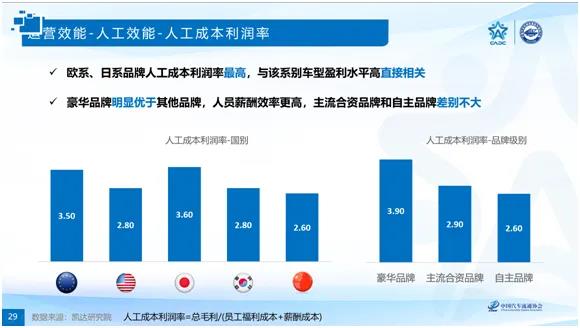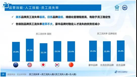 從衡量人力效能的員工流失率和人工成本利用率兩個指標來看,日系品牌流失率最低、人工成本利用率最高;而美系品牌員工流失率最高、人工成本利用率僅好于中系品牌;從品牌級別上看,不同級別品牌經銷商的員工流失率沒有差異,豪華品牌僅在人工成本利用率上優于主流合資品牌和自主品牌。